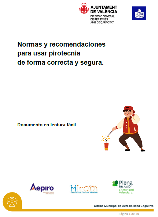 La Asociación Española de la Pirotecnia (AEPIRO) y la Dirección General de Personas con Discapacidad del Ayuntamiento de Valencia, en el marco de la campaña Pirotecnia y Respeto 2026 con motivo de las Fallas, editaron un año más un documento que recoge las Normas y recomendaciones para usar pirotecnia de forma correcta y segura. En este proyecto también participa Plena Inclusión Comunidad Valenciana y Fundación Mira’m.